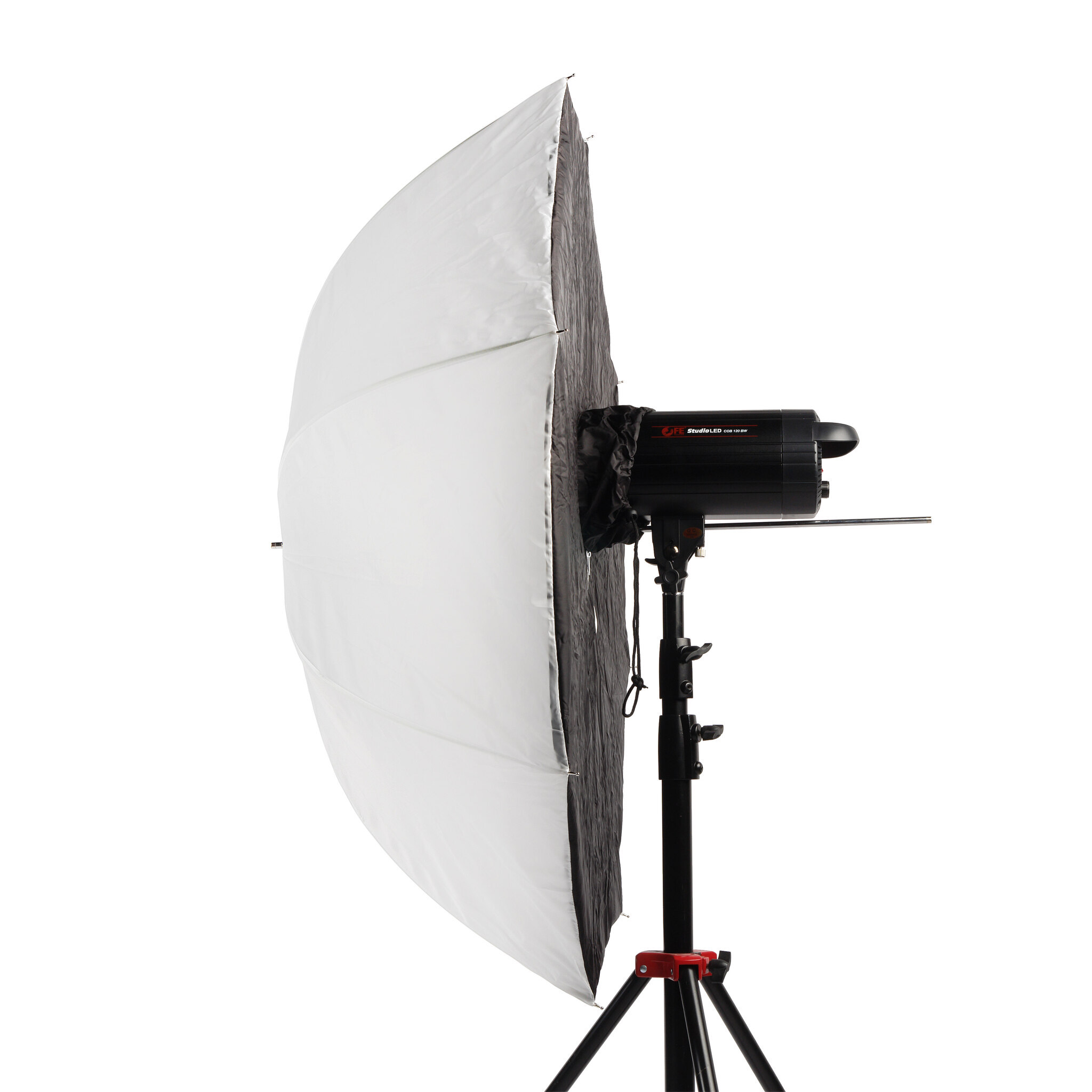 Зонт весом всего 460 г упаковывается в компактный чехол размером 80х15х9 см. Зонт можно легко использовать в студии (даже в качестве софтбокса) или взять с собой на плэнерную съемку.